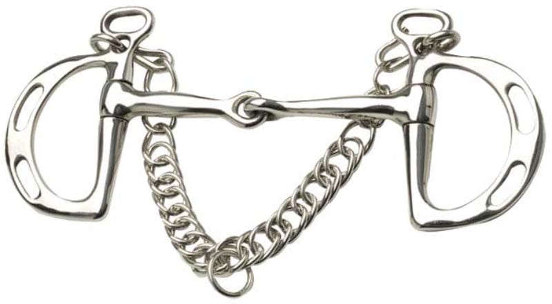 As with pelhams and weymouth bits, the bridle cheek pieces are attached by the eye at the top of the bit to produce a more direct poll action. The slotted cheeks allow the rider to alter the rein position to increase or reduce the curb action. Comes complete with double link curb chain.