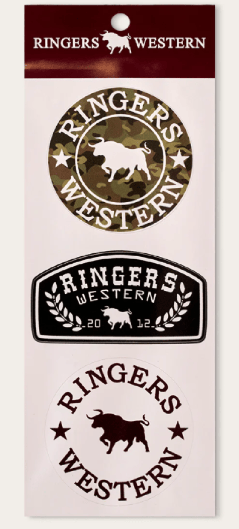 3 Pack of Ringers Western stickers. This pack includes vinyl stickers featuring three logos.