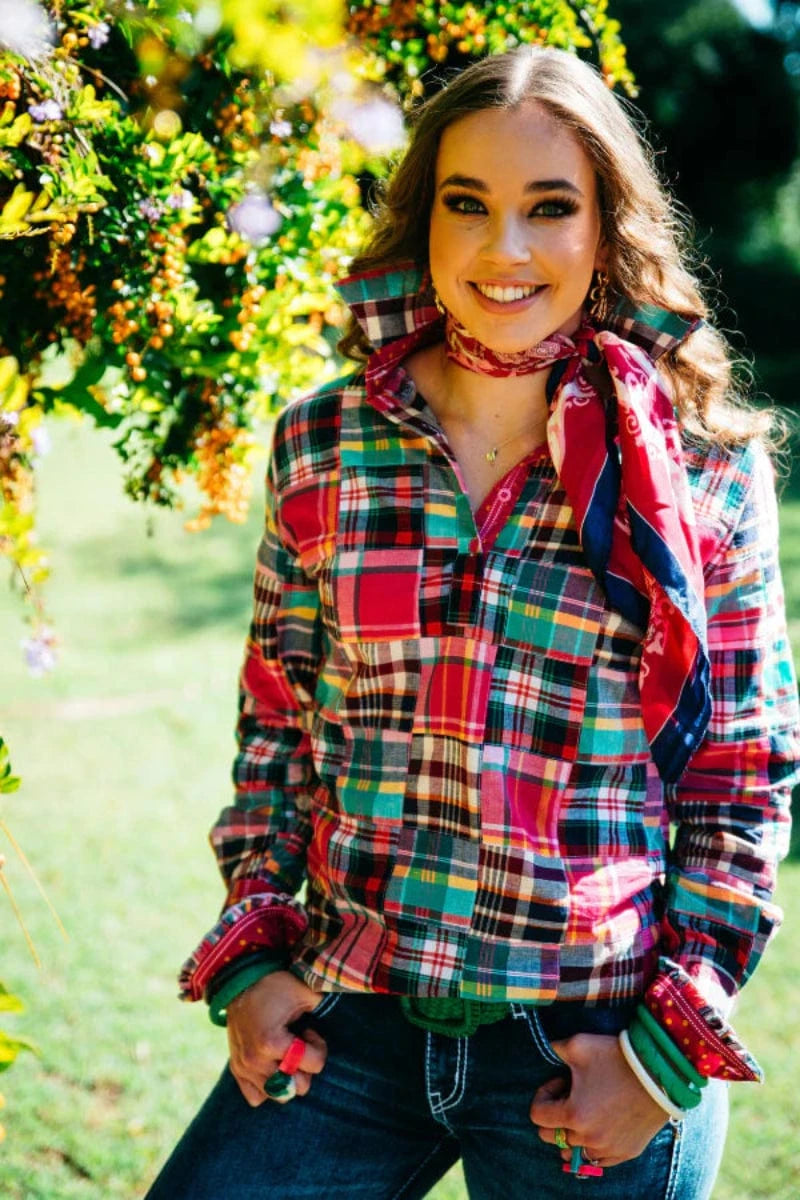 Tailored from a feature patchwork check featuring hot pinks, emerald green, navy and yellow, this is a standout shirt that will turn heads. The contrast fabric is a custom printed hot pink and yellow polka dot fabric and the garment is finished with hot pink grosgrain fabric with white top stitching. A year in, year out classic, this shirt will match with a wide variety of bottom co-ordinates for an easy, 'go-to' outfit. No darts front or back makes this shirt the roomiest of all our styles. Regular turn down collar with a little ruffle at the 5", 4 button cuff. Extra long sleeve and body allowance. * Now offered in size 6.