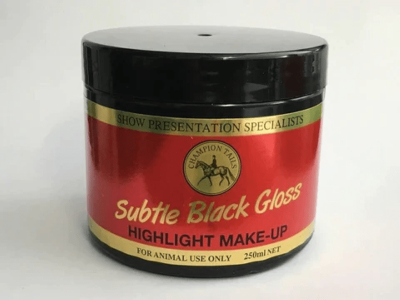 CHAMPION TAILS Highlight make-up is great for shading your horse or pony. The Blue Black is exactly that a very black make-up with a natural finish. The more you use it the more it will adhere to the hair. Put it on fairly thickly the night before around the eyes and then wipe off excess in the morning. Add the CHAMPION TAILS clear highlight if a glossy shine is required.