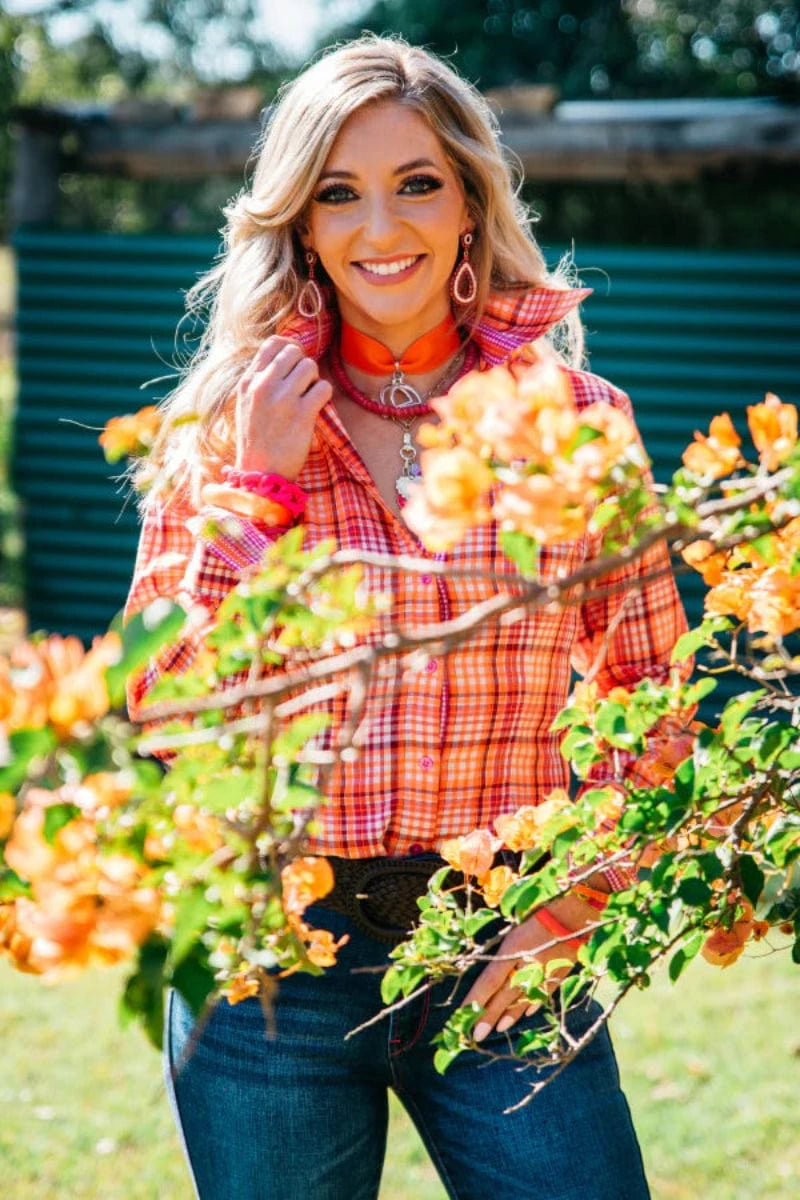 Our collared Arena shirt is a classic style with unmistakable H&H fit and finishings. The shirt is manufactured from a statement check fabric featuring hot pink, white and bright orange. The cuffs and placket are trimmed with a hot pink and white gingham fabric and finished with orange grosgrain ribbon with white top stitching. Longer sleeve and body allowance for a perfect fit. Full button though garment with 5", 4 button cuff. 100% Lightweight non stretch cotton fabric.