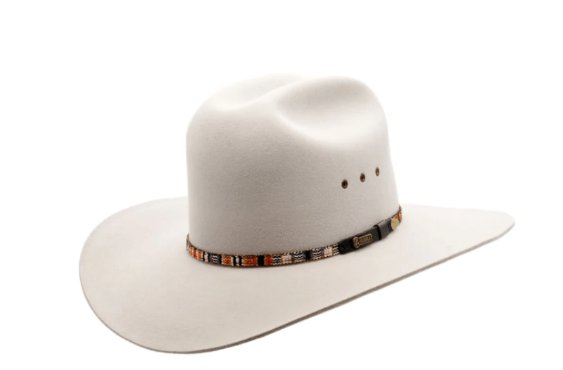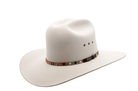 This Western hat features a tall, center-creased western crown and a broad, upswept brim.