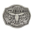 A small scalloped shaped antiqued silver finished Kid's Attitude buckle has a twisted rope edge while western filigree design surrounds a steer skull with the words "Little Buckaroo" across the top of the horns and a banner of with "Cowboy In Training" across the bottom. Classic western filigree markings decorate the back for added detail.