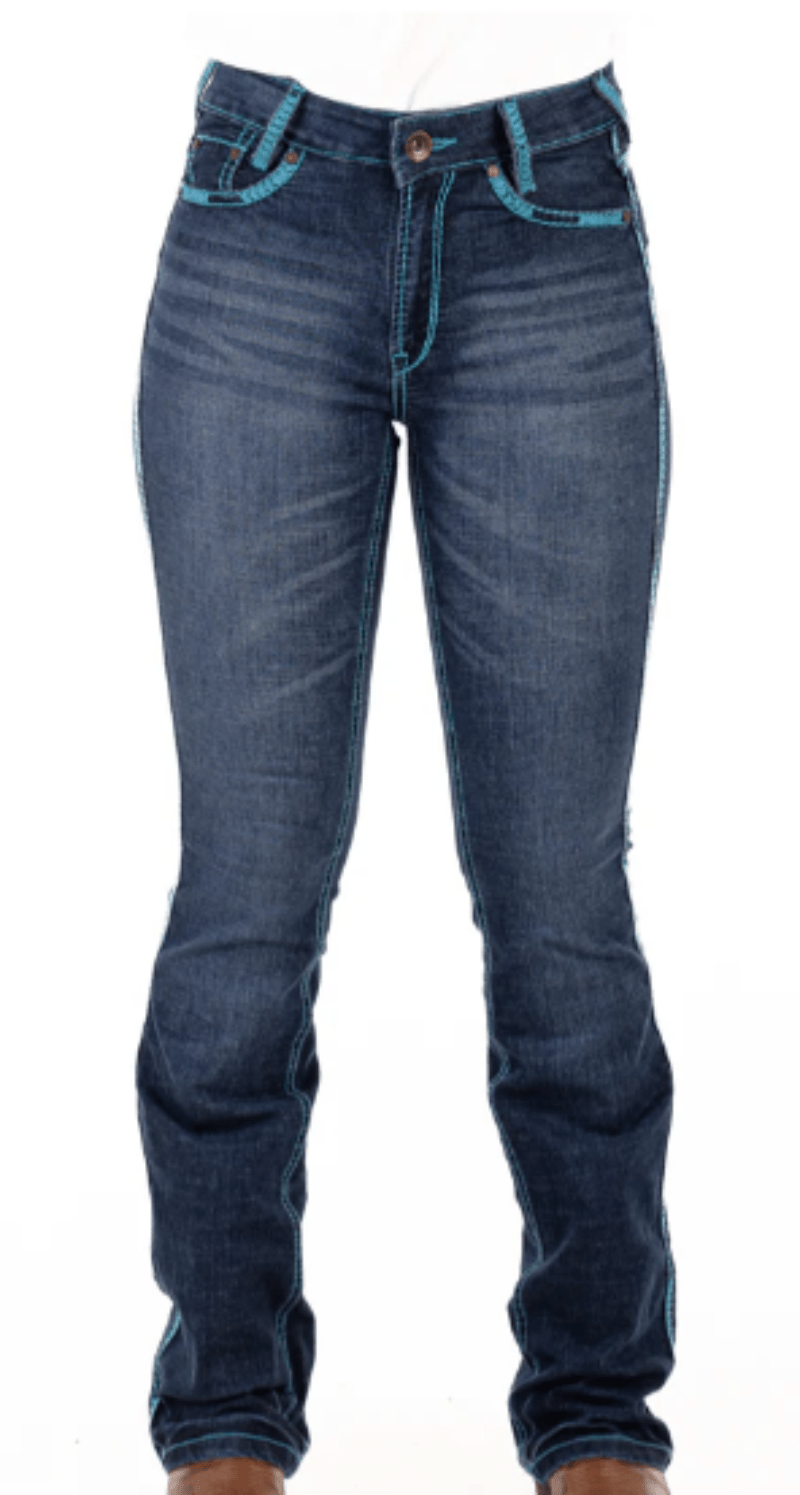 The "Kentucky" is a dark look denim featuring two row turquoise stitch with heart detail on the front and rear pockets, yoke and outer leg. Light whiskering at the thigh, and back of the knees. Light spray fronts of the thigh, back thigh and backs of the knees. Tagging detail to the back yoke and hem line. No physical distressing to the denim.